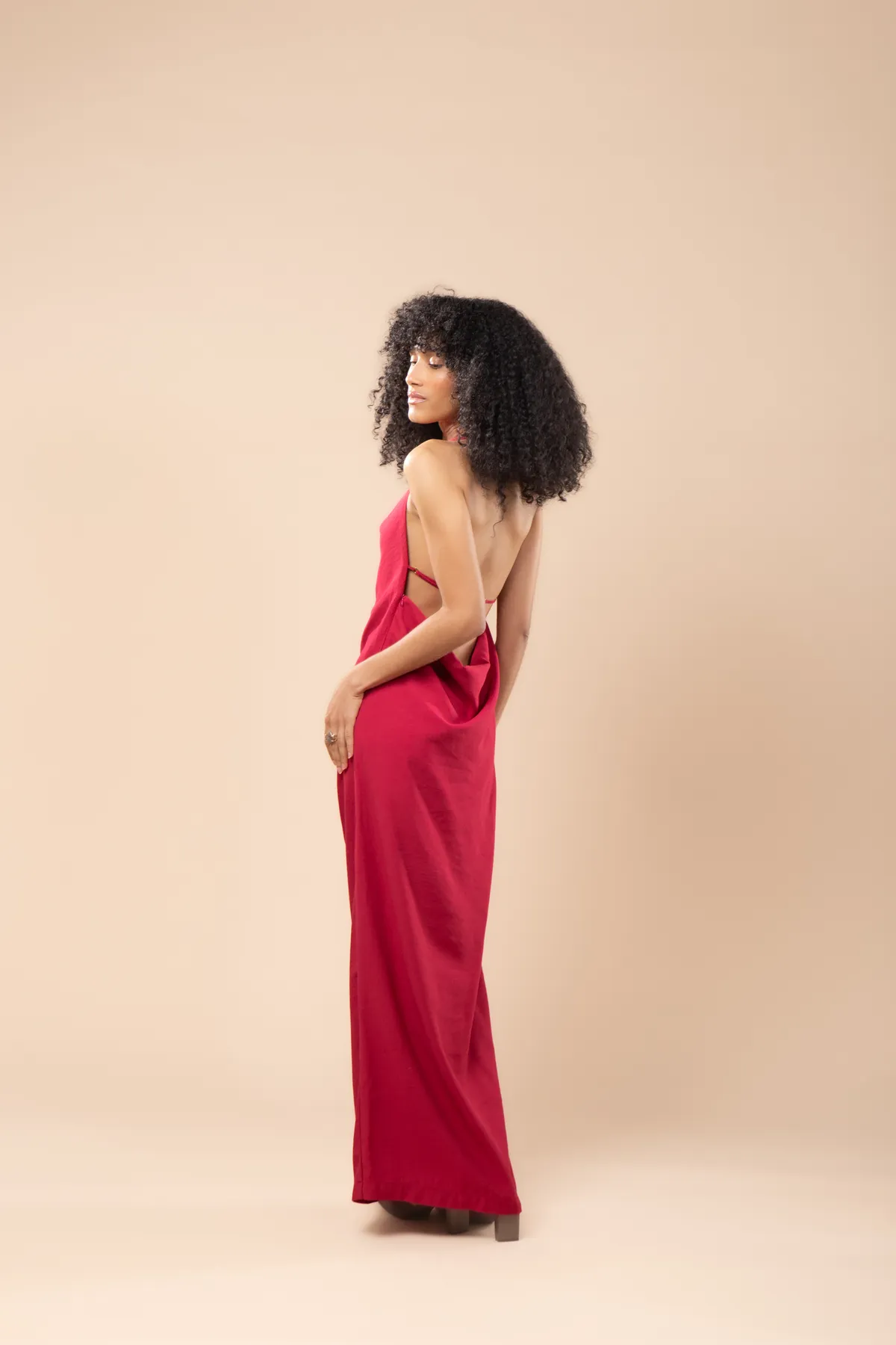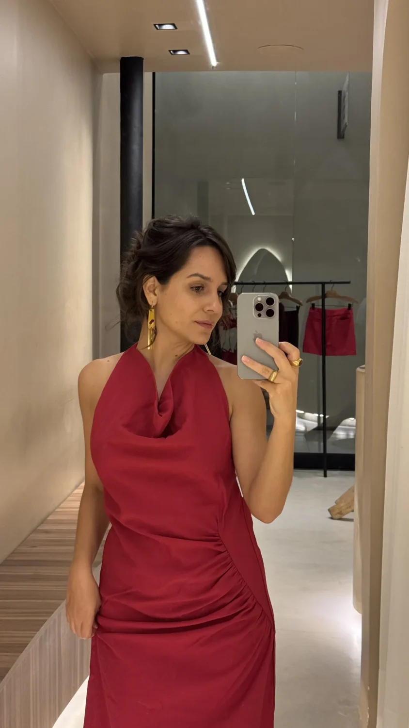 O Vestido Antônia possui um drapeado e decote degage na frente, e de forma ampla nas costas, unindo modernidade e sofisticação. Possui regulador nas costas e fechamento em botão na parte de trás do pescoço.